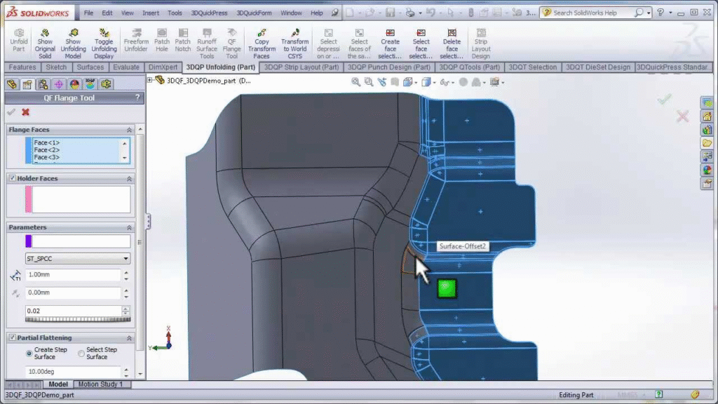 3DQuickForm is a specialized tool developed by 3D QuickTools Limited for SolidWorks users who deal with metal forming and sheet metal design. The software provides quick and accurate solutions for blank development, material thinning, and stress analysis.