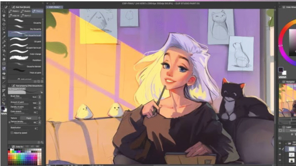 Clip Studio Paint EX is known for its natural brush feel and customizable tools that replicate the look and feel of real brushes and pens. It’s used by professional illustrators, manga artists, and studios around the world for its precision, flexibility, and speed.