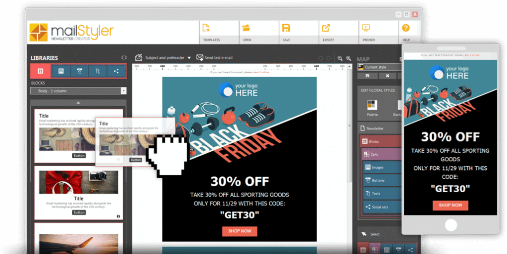 The software comes with a rich library of templates, layout blocks, and images, which can be fully customized to match your brand’s style. Once your design is ready, you can export it as an HTML file or send it through your preferred email marketing platform such as Mailchimp, SendinBlue, or Constant Contact.