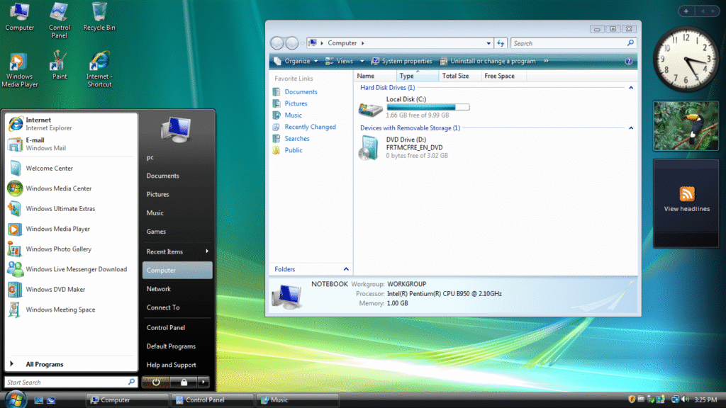 Windows Vista introduced a completely new look compared to Windows XP. The Aero graphical interface with transparent windows and smooth animations gave it a modern appearance for its time. It also included updates for better file organization, improved networking, and stronger built-in security.
